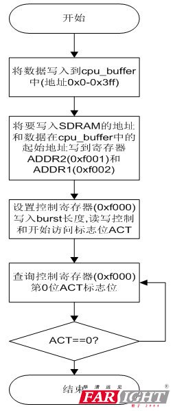 读取CONTROL_REG的数值,当ACT为“0”时,表示之前存入cpu_buffer 0xF0~0xFF的16个16bit的数据,已经被写入SDRAM中起始地址为“0x3FFFFF”的连续的8个地址中(SDRAM的数据宽度为32bit)。