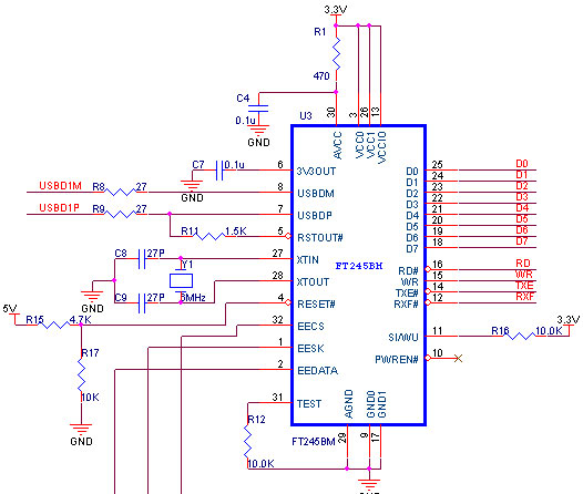 FT245的数据线D0~D7接至ARM的P1.16~P1.23,RD#,WR,TXE#,RXF#接至ARM的P0.10~P0.13。为了与ARM管脚电平兼容,FT245采用3.3V供电。