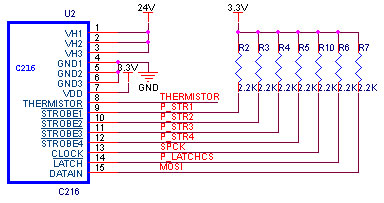 C216打印头各信号线加2.2 kΩ上拉电阻,数据通过ARM的SPI口串行输入。SPCK连接ARM芯片SPI口串行时钟引脚,P_LATCHCS连接ARM的SPI外设片选信号脚SSEL0脚,由于打印机只需单向接收数据,所以只连接MOSI脚。THERMISTOR接打印头内置热敏电阻,外加电路来检测打印头的温度,从而可对打印头作相应的保护。打印头工作需要24 V直流电压。由于每行1728点,且电源电流有限,所以必须进行打印头的加热功率控制。C216有4个加热选通信号(STROBEl~4),即1728个点可以分4次加热,每次多448个点。根据打印头参数,如每个加热点电阻为R=700 Ω时,消耗功率为31.0 mA/点;若所有点都加热时需电流1728点×31.0mA/点=53568 mA。所以设计中要根据实际加热点数通过软件进行一定的时序控制。