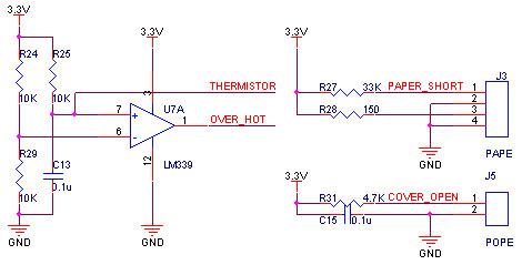 如果打印过程中打印头过热,就必须停止打印,否则会烧坏打印头。打印头内置热敏电阻由THERMISTOR连接到外部检测电路,经过LM339M比较器,一旦温度超过极限温度,就通过OVER_HOT脚发出低电平给主控芯片。从而可以及时采取相应的保护措施,如图4所示。