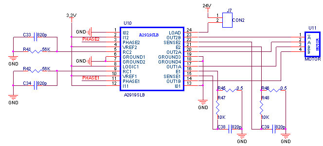 打印机走纸控制采用双极斩波驱动的步进电机来实现。本设计采用Allego公司的专用双全桥PWM步进电机驱动器A2919SLB来驱动电机。驱动器输出双路可直接驱动步进电机,PHASEl和PHASE2分别由ARM控制器输出相应脉冲来控制输出脉冲频率,从而得到理想的速度。走纸电机驱动电路如图5所示。