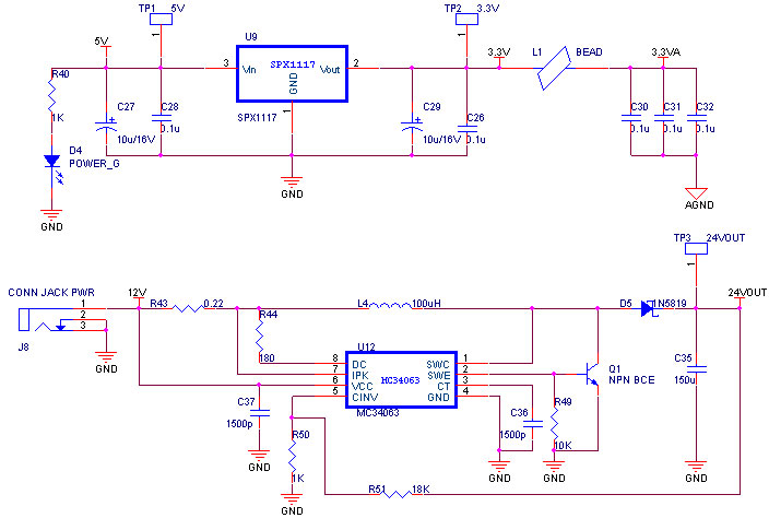 本系统中涉及到5种电源:5V,3.3V,3.3V模拟,12V和24V。通过USB接口取5V的电源,由LDO稳压器SPX1117完成5V到3.3V的电压转换,为主控芯片供电。打印机需要24V供电,从外部输入9~12V的电压通过电源转换芯片MC34063转换成24V。