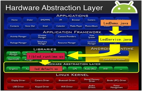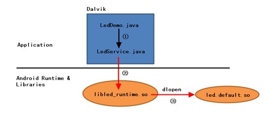 我们前面的示例代码中,将LedDemo.java和LedService.java都放在了一个APK文件里,这也就意味着这个应用程序编译完之后,它会运行在一个Dalvik虚拟机实例中,即:一个进程里,在LedService.java中加载了libled_runtime.so库,通过JNI调用了本地代码,根据动态库的运行原理,我们知道,libled_runtime.so在第一次引用时会被加载到内存中并映射到引用库的进程空间中,我们可以简单理解为引用库的程序和被引用的库在一个进程中,而在libled_runtime.so库中,又通过dlopen打开了库文件led.default.so(该库并没有被库加载器加载,而是被当成一个文件打开的),同样我们可以理解为led.default.so和libled_runtime.so在同一个进程中。