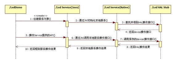 l 拿到了led设备的device_t结构之后,当LedDemo上的按钮按下时调用LedService对象的set_on和set_off方法,这两个LedService方法直接调用了本地服务代码的对应映射方法,本地方法直接调用使用device_t指向的函数来间接调用驱动操作代码。
