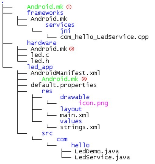 在Android的源码目录下,框架层服务代码应该放在frameworks/services/java/包名/目录下,由Android的编译系统统一编译生成system/framework/services.jar文件,由于我们的测试代码属于厂商定制代码,尽量不要放到frameworks的源码树里,我将其和LedDemo应用程序放在一起了,虽然这种方式从Android框架层次上不标准。