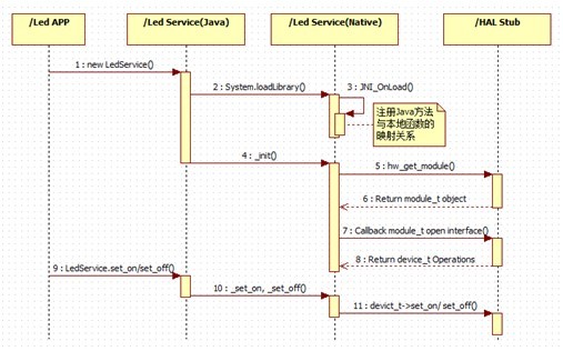 l LedService类加载时加载了对应的本地服务库,在本地服务库里Dalvik自动调用JNI_OnLoad函数,注册Java方法和本地方法映射关系。